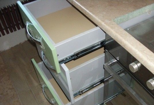 - Для удобного доступа к содержимому вместо шкафов с полками рекомендуется использовать выдвижные ящики. Так необходимые вещи всегда будут обозримы и легкодоступны. Самые большие ящики размещаются в низу кухни и предназначаются для хранения крупногабаритной и тяжелой утвари/припасов.